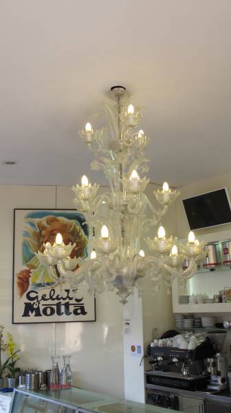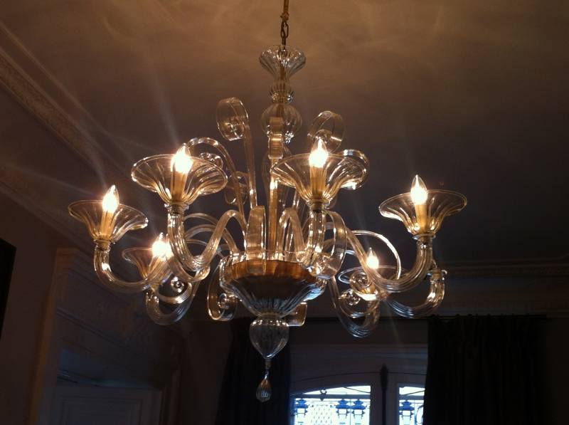 C'est créations sont proposées en verre transparent, rehaussé d’un filet d’or ou d’argent, les lustres en verre de Murano sont déclinés en différentes tailles et hauteurs. Appliques et candélabres assortis viennent compléter la gamme.