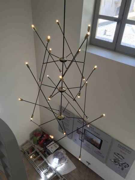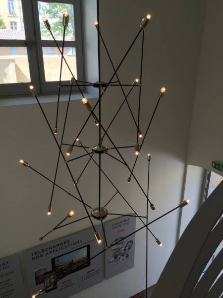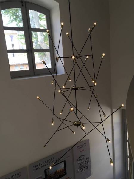 Ce lustre de 30 lumières composé de 15 bras de 3 tailles différentes, et monté sur 3 plateaux, composés de 5 éléments doubles articulés, afin de permette une rotation de chaque bras sur 180 degrés. Superposés les uns au dessus des autres, les 3 plateaux permettent de réaliser un enchevêtrement de lumières intéressant, adaptable en fonction du lieu et des goûts du client.